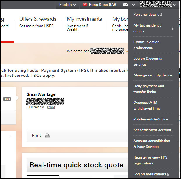 個人設定:口座名義をクリックするとメニューが表示されます。パスワードや各種設定などはこちらから。